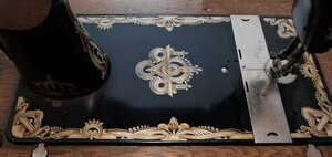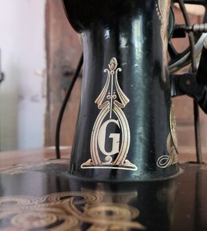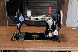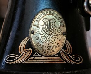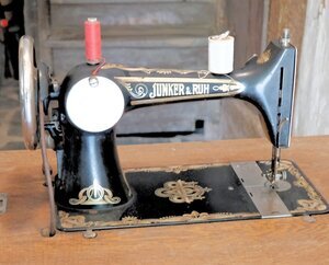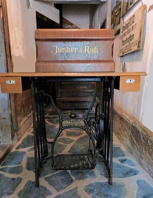 Eine Junker & Ruh aus dem Jahr 1901. Hergestellt im Werk Karlsruhe unter der Serien Nummer 668.880. Die Grundfarbe des Tretmodels ist schwarz mit goldfarbenen Ornamenten, die sich über den Arm und um die Bodenplatte verteilen. Auf der Vorder- und Rückseite steht groß der Firmenname Junker & Ruh, auf der Säuleninnenseite der Buchstabe „G“. Er steht für Schwingschiffchen Maschinen die primär für kleine Gewerbebetriebe hergestellt wurden. Der Aufspulapparat wird über das Handrad angetrieben und ist noch funktionsfähig. Das Schwingschiffchen ist vorhanden und samt Mechanik in gutem Zustand. Der Arbeitstisch ist aus Holz und war leicht vom Holzwurm befallen. Unterhalb davon gibt es 2 Schubladen zur Aufnahme von Nähutensilien. Das gusseisernem Untergestell mit Tretantrieb lässt ein Versenken der Nähmaschine nicht zu.