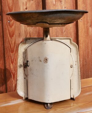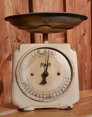 Federwaagen bestimmen ein Gewicht aufgrund der Verformung einer im Inneren der Waage befindliche Feder. Haushaltswaage des Herstellers AWR. Die Waage besteht - von oben nach unten - aus der Halterung für die runde Schale, der Anzeige des Gewichts mit Zifferblatt und Zeiger. Die Waage steht auf 3 Füßchen. Im oberen Teil des Ziffernblatts befindet sich die Aufschrift "AWR" in Zierschrift in der horizontalen Mitte. Etwas innerhalb des runden Rands des Ziffernblatts befindet sich eine Gewichtsskala in Kilo. Hergestellt wurden diese Waagen von etwa 1900 bis etwa 1930.