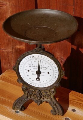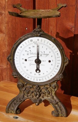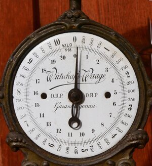 Wirtschaftswaagen sind entweder Federwaagen oder hydraulische Waagen. Die vorliegende Waage ist eine Federwaagen und bestimmt ein Gewicht aufgrund der Verformung einer im Inneren der Waage befindliche Feder. Federwaagen hatten ursprünglich den Nachteil, dass man das Gewicht nur auf 50g genau abwiegen kann und die Feder durch Gebrauch an Spannkraft verliert. Die Haushaltswaage besteht - von oben nach unten - aus einer ovalen Schale, einer Halterung in der letztere sicher liegt, der eigentlichen runden Anzeige mit Zifferblatt und Zeiger und drei Beinen. Das geschwungene Gehäuse ist mit Jugendstilelementen verziert. Die Waage besitzt die Aufschrift "Wirtschafts-Waage" in Zierschrift im oberen Teil und in der horizontalen Mitte des Ziffernblatts. In der vertikalen Mitte des Ziffernblatts seht links und rechts vom Zeiger jeweils "D.R.P." für Deutsches Reichs Patent. Weiter unten befindet sich die Aufschrift "Garantiert Genau". Etwas innerhalb des runden Rands des Ziffernblatts befindet sich eine Skala - außen von 0 bis 10 in Kilo und etwas kleiner und weiter innen von 0 bis 20 in Pfund. Leider findet sich kein Hinweis auf den Hersteller und das Herstellungsdatum. Federwaagen bestimmen ein Gewicht aufgrund der Verformung einer im Inneren der Waage befindliche Feder. Die Waage wiegt bis zu 10 Kilogramm mit einer Genauigkeit von 20 Gramm. Hergestellt wurden diese Art von Waagen von etwa 1880 bis etwa 1930. Zwischen 1880 und 1887 wurden in Deutschland mindestens 7 Patente für Wirtschaftswaagen erteilt. Für eine Suche im depatisnet (der Datenbank des Deutschen Patent- und Markenamts) ist es wichtig hierbei mit der damaligen Schreibweise also "Wirthschaftswaagen" bzw. "Wirthschaftswaage" im Feld Titel zu suchen. (Link zu Depatisnet siehe unter Weblinks). Um herauszufinden welches der angemeldeten Patente für dieses Waage relevant war, müsste die Waage zur Untersuchung der relevanten Technik aufgebrochen werden. Man kann wohl davon ausgehen, dass sie noch während der Laufzeit des relevanten Patent, also spätestens 1915 hergestellt wurde. Umgekehrt muss Sie auf Grund der Schreibweise "Wirtschaftswaage" und nicht "Wirthschaftswaage" nach der Rechtschreibreform von 1901 hergestellt worden sein.