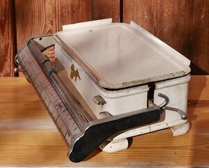 Laufgewichtswaage / Küchenwaage für den Kinderkaufladen mit dem des Herstellers Baufa (Baubeschlagfabrik GmbH, Menden). Laufgewichtswaagen sind asymmetrische Balkenwaagen. Dieses seit der römischen Schnellwaage bekannte Prinzip wurde in den Laufgewichts-Brückenwaagen weiterentwickelt. Mittels Verschieben der Gewichte auf der mit einer Messskala ausgestatteten Brücke kann das Gewicht des Wiegeguts ermittelt werden. Die Waage ist dann im Gleichgewicht, wenn der rechts an der Brücke angebrachte Marker auf gleicher Höhe wie der an der Waage fest angebrachte Marker ist. Die Waage ist bis 6,5 kg belastbar. Die Waage ist größtenteils weiß lackiert und steht auf 4 Füßchen. Die Schale, die Brücke und die Gewichte sind verchromt. An der Vorderseite der Waage und an der Gewichtsskala ist das Herstellerlogo Baufa des Herstellers angebracht. Die Gewichtsmessung erfolgt folgendermaßen: Die Schale wird mit dem Wiegegut gefüllt und drückt auf die unterhalb innerhalb des Gehäuses der Waage befindlichen Mechanik. Die Brücke klappt links nach unten und rechts nach oben. Das untere (große) Gewicht dient nun der "Grobeinstellung". Im Verlauf des Wiegens wird dieses so weit nach rechts verschoben, dass die Leiste mit der Skala gerade nicht nach rechts kippt. Das Gewicht lässt man nun bei der Aussparung der letzten davorliegenden Groß-Maßeinheit einrasten. Auf einer Schiene darüber befinden sich zwei weitere kleinere Gewichte. Das linke Gewicht dient beim Wiegevorgang zur bis auf 5 g genauen Feineinstellung. Das rechte Gewicht dient zur Elemierung der Tara. D.h. mit diesem wird die Waage in das Gleichgewicht gebracht, wenn die anderen beiden Gewichte auf 0 stehen und auf der Waage ein Behälter steht in den das Wiegegut eingefüllt wird, und der nicht mit gewogen werden soll. Wir bedanken uns beim Stadt- und Waagenmuseum Oschatz für die Unterstützung bei der Inventarisierung dieser Waage.