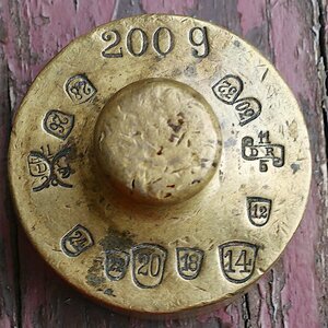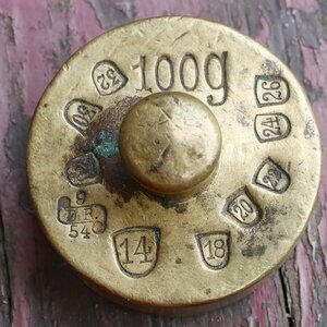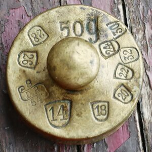 Satz von Gewichtsstücken zur Massebestimmung mit einer Balkenwaage von 1g bis 500g. Die Gewichte von 1g bis 200g sind aus Messing, das große aus Eisen. Die Gewichte ab 50g aufwärts tragen eingeschlagene Eichmarken. Das 1 kg Gewicht besitzt eine Plombe mit einem schwer lesbaren Stempel des Eichamts. Bedeutung der Eichmarken: Die Zahlen (plus 1900) in den Wappenschilden bedeuten, dass die Waage bis zu diesem Jahr geeicht ist. Über und unter dem geschweiftem Band mit der Aufschrift "D.R." (für Deutsches Reich) sind Nummerncodes mit folgender Bedeutung: Die Zahl über dem geschweiften Band ist der Code für den Eichaufsichtsbezirk, die Zahl darunter der Code für das Eichamt (ehemals Eichstelle), relativ zum Eichaufsichtsbezirk. Codes für Eichaufsichtsbezirke: 9: Dortmund 11: Köln Codes für Eichämter 9->54 Eichaufsichtsbezirk Dortmund – Eichamt Gevelsberg 11->5 Eichaufsichtsbezirk Köln - Eichamt Barmen 11->28 Eichaufsichtsbezirk Köln – Eichamt Remscheid Besonders interessant ist die Plombe am 1kg Gewicht: 7 -> DR ->9 Jahresabgeabe 58x Generell passen die Jahreszahl „58“ und das Eichzeichen „7 / DR / 9“ nicht ganz zusammen. Dies liegt daran dass die Ordnungsziffer „9“ von 1896 bis 1926 dem Eichamt Sonderburg, was heute dänisch ist, zugeordnet war und von 1941 bis 1945 war die „9“ dann dem Eichamt Schwerin zugeordnet. Früher gab es immer mal wieder Zusammenschlüsse der Eichbehörden im Norden, den es nach seit 2004 tatsächlich wiedergibt. In der Zeit von 1926 bis 1941 und nach 1945 gab es keine Eichstelle mit der Ordnungsziffer „9“ im Aufsichtsbezirk Kiel. Es bleibt zu vermuten, dass bei Aufbringung des Jahresstempel „58“ das bereits auf dem Gewichtstück befindliche Eichzeichen „7 / DR / 9“ erhalten geblieben ist, was eigentlich nicht sein dürfte. Aber auch hier sind (rechtliche) Theorie und Praxis scheinbar nicht unbedingt immer deckungsgleich. Fazit: Auch wenn die ausführende Stelle nicht mehr nachvollzogen werden kann, stammt das Gewichtstück wohl aus dem hohen Norden J. Wir bedanken uns beim Landesamt für Mess- und Eichwesen Rheinland-Pfalz für die Informationen zum Eichwesen.