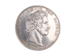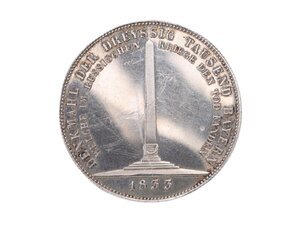 Die Vorderseite zeigt ein Abbild des Obelisken, den Ludwig I. auf dem Karolinenplatz in München als Ehrenmal errichten ließ. Er wurde 1833 vom Architekten Leo von Klenze für die 30.000 bayerischen Soldaten entworfen, die im napoleonischen Russlandfeldzug 1812 gefallen waren. Auf drei Stufen aus Marmor erhebt sich auf einem viereckigen Bronzesockel der Obelisk. Die Gesamthöhe des Pfeilers beträgt 29 Meter. Die Einweihung fand am 18. Oktober 1833 statt, dem 20. Jahrestag der Völkerschlacht bei Leipzig. Die Inschrift lautet: "Denkmahl de Dreyssig Tausend Bayern welche im Russischen Kriege den Tod fanden 1833". Der Revers zeigt König Ludwig im Profil. Bei den sogenannten Geschichtstalern handelt es sich um 38 Münzen, die Ludwig I. im Laufe seiner Regierungszeit (1825-1848) schlagen ließ. Mit ihnen schuf er etwas zu dieser Zeit in Europa einzigartiges. Er verfolgte dabei das Anliegen, patriotische Gefühle zu stärken und die Öffentlichkeit an das Königshaus zu binden. Die Taler reihen sich in die königlichen Denkmalstiftungen ein und entsprechen auch der zeitgenössischen Hinwendung zum Historischen, wobei ebenso aktueller landeswichtiger Ereignisse gedacht werden sollte. Die Geschichtstaler nutzte Ludwig I. gekonnt, um sich und seine Familie ins Bild zu setzen. Die Darstellungen verweisen auf die Fortschritte Bayerns unter seiner Regentschaft im Bereich der Gesetzgebung, Infrastruktur, des Handels und des Bildungswesens. Die glückliche Verbindung von Tradition und Fortschritt ergibt sich im Überblick der einzelnen Taler, die sowohl die Verbindungen zur katholischen Kirche als auch die Förderung moderner Vorhaben wie der Eisenbahn als gedenkwürdig herausheben. Ludwig verweist auf die von ihm gestifteten Denkmäler zu Ehren der bayerischen Armee sowie verdienter Persönlichkeiten des Landes, darunter Vertreter aus Kunst und Literatur, womit er sie in doppelter Weise ins Gedächtnis der Bürgerinnen und Bürger einschreibt. Die Geschichtstaler wurden mitunter auch zur Kommunikation mit den Untertanen verwendet, so bedankte sich Ludwig in monarchischer Manier mittels einer Münzprägung von 1830 für die Treue der Bayern während der französischen Unruhen. Die propagandistische Absicht, patriotische Umlaufmünzen zu schaffen, erfüllte sich nicht, da die Geschichtstaler nur in geringen Auflagen geprägt wurden und eher bei Sammlern beliebt waren und weniger im Zahlungsverkehr genutzt wurden.