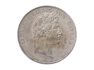 Die Vorderseite zeigt ein Abbild des Obelisken, den Ludwig I. auf dem Karolinenplatz in München als Ehrenmal errichten ließ. Er wurde 1833 vom Architekten Leo von Klenze für die 30.000 bayerischen Soldaten entworfen, die im napoleonischen Russlandfeldzug 1812 gefallen waren. Auf drei Stufen aus Marmor erhebt sich auf einem viereckigen Bronzesockel der Obelisk. Die Gesamthöhe des Pfeilers beträgt 29 Meter. Die Einweihung fand am 18. Oktober 1833 statt, dem 20. Jahrestag der Völkerschlacht bei Leipzig. Die Inschrift lautet: °Denkmahl der Dreyssig Tausend Bayern welche im Russischen Kriege den Tod fanden 1833°. Die Vorderseite zeigt starke Korrosionserscheinungen. Bei den sogenannten Geschichtstalern handelt es sich um 38 Münzen, die Ludwig I. im Laufe seiner Regierungszeit (1825-1848) schlagen ließ. Mit ihnen schuf er etwas zu dieser Zeit in Europa einzigartiges. Er verfolgte dabei das Anliegen, patriotische Gefühle zu stärken und die Öffentlichkeit an das Königshaus zu binden. Die Taler reihen sich in die königlichen Denkmalstiftungen ein und entsprechen auch der zeitgenössischen Hinwendung zum Historischen, wobei ebenso aktueller landeswichtiger Ereignisse gedacht werden sollte. Die Geschichtstaler nutzte Ludwig I. gekonnt, um sich und seine Familie ins Bild zu setzen. Die Darstellungen verweisen auf die Fortschritte Bayerns unter seiner Regentschaft im Bereich der Gesetzgebung, Infrastruktur, des Handels und des Bildungswesens. Die glückliche Verbindung von Tradition und Fortschritt ergibt sich im Überblick der einzelnen Taler, die sowohl die Verbindungen zur katholischen Kirche als auch die Förderung moderner Vorhaben wie der Eisenbahn als gedenkwürdig herausheben. Ludwig verweist auf die von ihm gestifteten Denkmäler zu Ehren der bayerischen Armee sowie verdienter Persönlichkeiten des Landes, darunter Vertreter aus Kunst und Literatur, womit er sie in doppelter Weise ins Gedächtnis der Bürgerinnen und Bürger einschreibt. Die Geschichtstaler wurden mitunter auch zur Kommunikation mit den Untertanen verwendet, so bedankte sich Ludwig in monarchischer Manier mittels einer Münzprägung von 1830 für die Treue der Bayern während der französischen Unruhen. Die propagandistische Absicht, patriotische Umlaufmünzen zu schaffen, erfüllte sich nicht, da die Geschichtstaler nur in geringen Auflagen geprägt wurden und eher bei Sammlern beliebt waren und weniger im Zahlungsverkehr genutzt wurden.