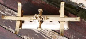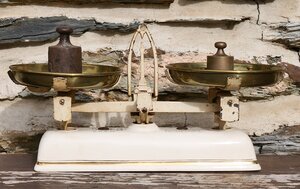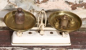 Weiße Balkenwaage (Zeigerwaage) des Herstellers Krups nach dem System Roberval. Vereinfacht gesagt, wird hier eine Balkenwaage durch einen zweiten Balken unterhalb des ersten Balkens ergänzt. Dieser bewirkt, dass das Moment am Waagebalken von der genauen Position der Gewichte auf der Schale unabhängig ist. Oben auf dem Gehäuse steht links "5 KG" was die maximale Beladung bezeichnet sowie "D.R.G.M", eine Abkürzung für "Deutsches Reich Gebrauchs Muster" ist. Leider sind die Unterlagen der Vorkriegs-Gebrauchsmuster nicht erhalten (Kriegsverlust). Rechts auf dem Gehäuse steht "KRUPS ROBERVAL". DIe Waage besitzt zwei Schalen aus Messing. Am Mittelgelenk ist ein nach oben gerichteter Zeiger angeschraubt. Wenn er senkrecht nach oben zeigt, ist das Gewicht in beiden Waagschalen identisch. Um das Ablesen zu erleichtern umgibt ein fixer Metallbogen mit einer Markierung oben in der Mitte den beweglichen Zeiger. Am Fuß des Gehäuses befindet sich ein Goldband.