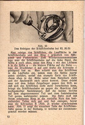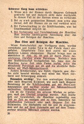 Auf 26 Seiten im Format 10 x15 cm werden die Nähmaschinen der Klassen 30 und 30/31 von Pfaff, sehr detailliert beschrieben. 22 s/w Abbildungen ergänzen den Text. Neben den Erläuterungen zum Gebrauch sind noch Empfehlungen zum Reinigen und Pflegen der Maschine enthalten. Auf den letzten Seiten gibt es noch Ratschläge bei Störungen. Der ehemalige Besitzer, so der aufgebrachte Stempel war ein Herr Karl Schmitt aus Offenbach am Main.
