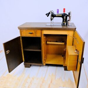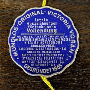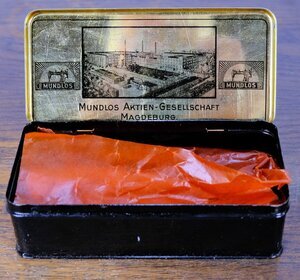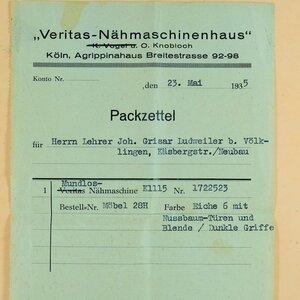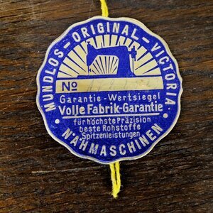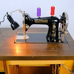 Die Firma Mundlos aus Magdeburg existierte seit 1863. Unser Objekt, eine „Mundlos Original-Viktoria“ mit der Fabriknummer 1.722.523. Lt. Packzettel wurde sie im Mai 1935 an Herrn Lehrer, Joh. Grisar aus Ludweiler b. Völklingen, Käsbergstr(Neubau), ausgeliefert. Das Modell ist versenkbar und in ein spezielles Vitrinenmöbel eingebaut. (lt.Lieferschein: Ausstattung 28H). Die Vitrine ist in Eiche furniert, die vorderen Türen in Nussbaum. Die Nähmaschine ist schwarz lackiert und trägt auf dem Maschinenarm beiderseits den Firmennamen. Die Grundplatte ist mit einem rundum laufenden, goldfarbenen Muster verziert. Angetrieben wir die Maschine durch einen Tretmechanismus, jedoch ist die Anbaumöglichkeit eines E Motors ist bereits vorhanden. Die im Schrank integrierten Schubladen beinhalten noch einige Ersatzteile. z Bsp. eine Blechschachtel, innen und Außen mit „Mundlos“ Werbung bedruckt (s. Bild), mehrere Nadelsätze Nr. 705, eine Original Gebrauchsanweisung der Maschine (s. Link) ein Original Packzettel von 1935, ein „Garantie-Wertsiegel“ mit einer Auflistung internationaler Auszeichnungen und eine funktionsfähige Nähmaschinenbeleuchtung. Technisch handelt es sich um eine Geradstich, Flachbett Nähmaschine und Zentralspule.
