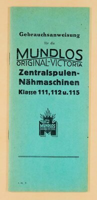 Die Original Gebrauchsanweisung für die Mundlos Victoria Modelle 111,112 und 115 ist recht gut erhalten. Auf 46 Seiten, wird der gemeinsame Teil der verschiedenen Modelle, sowie die Besonderheiten der einzelnen Typen ausführlich beschrieben. Integriert sind komplette Ersatzteillisten aller 3 Typen. Die letzten Seiten beinhalten Werbung in eigener Sache. Das Format ist mit 9 x 20,5 cm ungewöhnlich.
