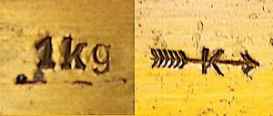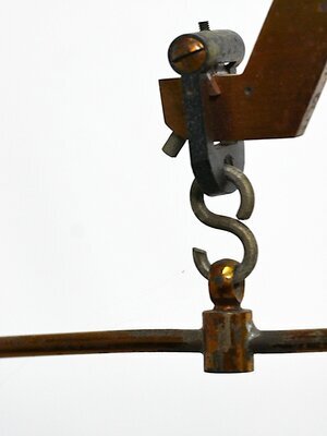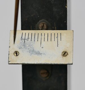 Große Rezepturwaage (Balkenwwaage, Apothekerwaage) zum Abwiegen chemischer Substanzen im Labor der Apotheke verwendet. Die Waage diente der Vergleichsmessung kleinerer Mengen durch Verwendung von Gewichtssätzen auch mit sehr kleinen Gewichten. Die Waage steht auf einem (wohl später ergänztem) Holzbrett. Der quadratische Ständer ist schwarz lackiert. An ihm klebt ein Eichaufkleber. Darüber befindet ist eine Skala mit Strichen aber ohne Zahlen für den Zeigestab der Waage am Ständer angebracht. Der Balken aus Messing zeigt mehrere Punzen. An seinen Enden sind die Halterungen der Waagschalen locker aufgehängt. Am Mittelgelenk befindet sich ein mit dem Waagebalken fest verbundener schmaler, langer und nach unten zeigender Zeiger. Zeigt er senkrecht nach unten, so ist die Waage im Gleichgewicht. Auf dem Querbalken befinden sich links 7 punzierte Eichstempel. Ganz rechts der Eichstempel mit geschweiftem Band und der Inschrift D.R. (für Deutsches Reich). Die "22" oberhalb des geschweiften Bandes steht für den zuständigen Eichaufsichtsbezirk in diesem Fall "Stuttgart". Die "8" darunter bezeichnet innerhalb dieses Bezirks das Eichamt Ebingen. Rechts von diesem befinden sich die Markierungen für die Jahre 42, 64, 66,68,70,74. Diese Zahlen bedeuten bis zu welchem Jahr die Eichung gültig war. Am Ständer befindet sich ein neuerer Aufkleber von der letzten Eichung - links von oben nach unten 11 D 1, was Eichaufsichtsbehörde Nordrhein-Westfalen mit Sitz in Köln, Eichamt Aachen bedeutet. Rechts im Schild die Zahl 78 und darunter die Aufschrift "Geeicht bis 1978". Dabei steht 11 für Eichaufsichtsbehörde Nordrhein-Westfalen mit Sitz in Köln und 1 für das Eichamt Aachen. Der ° zwischen D und R bedeutet, dass es sich um die Eichung einer Präzisionswaage (Feinwaage) handelt. Auf dem rechten Ausleger des Waagebalkens die Punzierung "1 kg" was sich auf die maximale für diese Waage zulässige Last beziehen dürfte. In der Mitte des Waagebalkens findet sich die Punzierung "PAULUS & THEWALT, HÖHR". Die Firma existiert auch heute noch unter dem Namen Wepa-Apothekenbedarf. An der Rückseite des Waagebalkens befindet sich rechts ein mit einem Pfeil durchschossenes K. Dies ist das Firmenlogo des Unternehmens "Kern, Gottlieb & Sohn" in Balingen (Schwäbische Alb). Wie könnte es gewesen sein? Die Waage hat Punzierungen von verschiedenen Herstellern. Die Eichamt-Punzierungen von 1940 bis 1972 stammen alle vom Eichamt Ehingen, das in der Nähe von Balingen liegt. Somit liegt die starke Vermutung nahe, dass Kern&Sohn der Hersteller ist, die Waage dann später ins Rheinland verkauft, von Paulus&Thewalt überholt, vom Eichamt Aachen neu geeicht wurde und von dort dann nach dem Jahr 2000 in unser Museum kam. Wir bedanken uns beim Landesamt für Mess- und Eichwesen Rheinland-Pfalz für die Informationen zum Eichwesen.