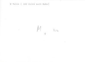 Fotografie einer Motorwalze Typ M. Die Aufnahme zeigt die Straßenwalze beim Verdichten des Untergrundes einer im Bau befindlichen Straße. Die Walze Typ M verfügte über einen zweizylindrigen Dieselmotor, der die an der Hinterachse angebrachten zwei Walzenräder antrieb. Gelenkt wurde die Maschine über die Vorderachse und das dort angebrachte breite Walzenrad. Das Gesamtgewicht der Verdichtungsmaschine betrug ca. zehn Tonnen. Der Fahrerbereich der abgebildeten Baumaschine ist überdacht. Am Frontbereich der Motorhaube ist unter dem Firmenlogo der Name Zettelmeyer abgebildet. Die fotografierte Walze verfügt über zwei seitlich neben der Motorhaube angebrachte Lampen. Damit konnte die zu befahrende Strecke ausgeleuchtet werden. Seitlich hinter der Walze ist eine dort abgestellte Schubkarre zu erkennen. Die Fotografie bedeckt ca. zweidrittel des etwa postkartengroßen Fotokartons. Auf der Rückseite dieses Kartons befindet sich ein mit einer Schreibmaschine aufgedruckter Text. Dieser lautet: "M Walze (100 Stück nach Kuba)". Darunter ist der handschriftlich mit einem Bleistift angebrachte Hinweis zu "M. Kuba" erkennbar. Das Datum der Fotografie ist nicht bekannt.