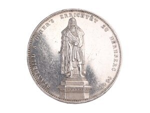 Die Münze zeigt das Standdenkmal Albrecht Dürers in Frontalansicht. Dürer trägt einen langen Mantel mit Pelzkragen. Die umlaufende Aufschrift lautet: "Standbild A. Dürer´s errichtet zu Nürnberg 1840". Der Revers zeigt König Ludwig I. im Profil. Anlässlich des 300. Todestages Albrecht Dürers 1828 beschlossen der Nürnberger Magistrat und König Ludwig I. von Bayern, dem deutschen Maler ein Denkmal auf dem früheren Milchmarkt bzw. späteren Albrecht-Dürer-Platz zu errichten. Die Figur wurde 1837 bis 1840 vom Bildhauer Christian Daniel Rauch entworfen und vom Bronzegießer Jacob Daniel Burgschmiet ausgeführt. Die 2,95 Meter hohe Plastik stellt Dürer mit Pinsel, Stift und Lorbeerzweig in der rechten Hand dar. Dürer galt im 19. Jahrhundert und gilt auch noch heute als der bedeutendste Maler und Zeichner Nürnbergs, wenn nicht des deutschsprachigen Raums, der Renaissance. Das Albrecht-Dürer-Denkmal gehört zu den bedeutendsten Werken der klassizistischen Bildhauerei. Es ist das erste Künstlerdenkmal Deutschlands und bildete den Auftakt zur Ehrung weiterer Persönlichkeiten durch Ludwig I. in den folgenden Jahren. Die Geschichtstaler nutzte Ludwig I. gekonnt, um sich und seine Familie ins Bild zu setzen. Die Darstellungen verweisen auf die Fortschritte Bayerns unter seiner Regentschaft im Bereich der Gesetzgebung, Infrastruktur, des Handels und des Bildungswesens. Die glückliche Verbindung von Tradition und Fortschritt ergibt sich im Überblick der einzelnen Taler, die sowohl die Verbindungen zur katholischen Kirche als auch die Förderung moderner Vorhaben wie der Eisenbahn als gedenkwürdig herausheben. Ludwig verweist auf die von ihm gestifteten Denkmäler zu Ehren der bayerischen Armee sowie verdienter Persönlichkeiten des Landes, darunter Vertreter aus Kunst und Literatur, womit er sie in doppelter Weise ins Gedächtnis der Bürgerinnen und Bürger einschreibt. Die Geschichtstaler wurden mitunter auch zur Kommunikation mit den Untertanen verwendet, so bedankte sich Ludwig in monarchischer Manier mittels einer Münzprägung von 1830 für die Treue der Bayern während der französischen Unruhen. Die propagandistische Absicht, patriotische Umlaufmünzen zu schaffen, erfüllte sich nicht, da die Geschichtstaler nur in geringen Auflagen geprägt wurden und eher bei Sammlern beliebt waren und weniger im Zahlungsverkehr genutzt wurden.