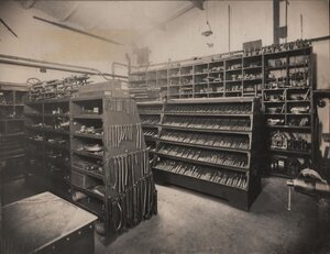 Zwei Fotografien die im Jahre 1930 im Bereich der Werkzeugausgabe entstanden sind. Die erste Aufnahme zeigt in Form einer seitlichen Fotografie einen größeren Ausschnitt mit insgesamt vier großen Regalen. Die beiden im rechtwinkelig gestalteten Raum vor den Außenwänden aufgestellten Regale überragen die beiden mitten im Raum befindlichen Gestelle. Am rechten Bildrand ist ein auf einer Werkbank befestigter Schraubstock und am linken Bildrand eine thekenähnliche Ablagefläche zu erkennen. Das zweite Foto zeigt den Durchgang mit zwei im Raum aufgestellten Regalen. Am rechten und linken Bildrand sowie auf der Stirnseite des abgebildeten Ganges sieht man offene Regale mit einer Vielzahl von dort gelagerten Werkzeugen. Die Fotografien wurden in Konz in einer zwischen Grana- und Goethestraße gelegenen Fabrikhalle der Fiorma Zettelmeyer aufgenommen. Die Aufnahmen stammen aus dem Kalenderjahr, in dem der Firmengründer Hubert Zettelmeyer verstorben ist.