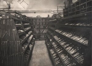Schwarz-Weiß-Aufnahmen der Werkzeugausgabe der Firma Zettelmeyer