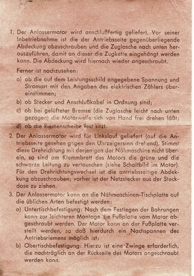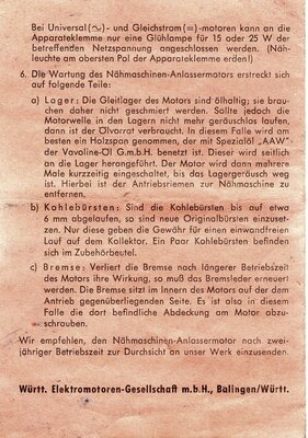Haushaltsnähmaschinen wurden oftmals mit einem Elektromotor der WEG - (Württ. Elektromotoren Gesellschaft mbH) aus Balingen ausgestattet. Unsere Anweisung gilt für die Typen ZWN ZUN und ZGN . Auf vier orange eingefärbten, verblassten Seiten, im DIN A6 Format, wird die Handhabung und die Pflege erleutert.