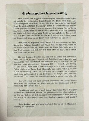 Anleitung für den Gebrauch vom Stopf-und Stickfuß "Jura" der Firma Singer. Auf der Vorderseite des DIN A 5 Blattes findet sich eine Abb. und der Hinweis, dass dies moderne Zubehör sich besonders eignet "zum Verstopfen von Löcher und Winkelrissen in Kostümen und Herrenkleidern, sowie zum Ausbessern von Wäsche, Gardinen und dergleichen, sowie zum Sticken" . Die Rückseite erklärt detailliert den Gebrauch