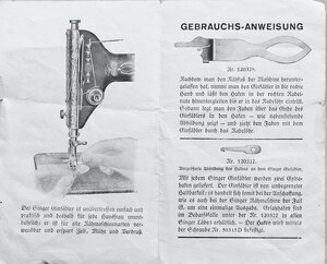 Singer Einfädler "einfach, unübertroffen, praktisch - er spart Zeit, Mühe und Verdruss. - Für alle Nähmaschinen geeignet", so die Werbebotschaft auf der Verpackung. Die Gebrauchsanweisung, ein doppelseitig bedruchtes DIN A 5 Blatt mit Abbildungen zum Gebrauch des Einfädlers, samt möglicherweise benötigter Ersatzteile und deren Nummern. Auf der Rückseite macht Singer Werbung noch in eigener Sache. Beworben wir das "genz besonders geeignete" Singer Öl, " die hervorragende Beschaffenheit" von Singer Nadel und der Hinweis auf die Singer Filialen die überall zu finden sind.