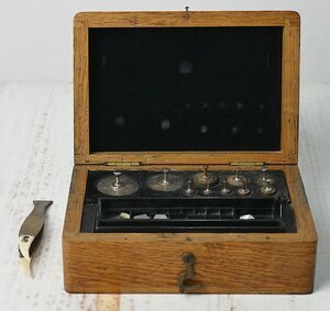 Rechteckiges Gewichtskästchen aus hellem, lackiertem mit Samt gefüttertes Holzkästchen mit Scharnierdeckel mit einem Gewichtssatz für eine Feinwaage. Vorne befindet sich ein Verschlusshaken. Der Kasten enthält in filzunterlegten Vertiefungen für 11 Ausgleichsgewichte zwischen 100 g und 1g. Vor diesen befinden sich 13 Aussparungen für Gewichtsplättchen zwischen 500 mg und 1mg. Von diesen sind allerdings nur 7 erhalten. Eine weitere Aussparung ist für eine vorhandene Pinzette vorgesehen. Im Deckel sind keine Aussparungen für die Köpfe der Gewichte vorhanden, aber man sieht im Samt die Abdrücke ihrer Köpfe. Es sind folgende Gewichte vorhanden: 100g, 50 g 20 g, 10 g, 10 g, 5 g, 2 g, 2 g, 1g. In einem mit einem transparenten Kunststoffdeckel abdeckbaren Fach befinden sich in individuellen Vertiefungen 8 Gewichtsplättchen zwischen 500 mg und 20 mg. 6 Plätze für (kleine) Gewichtsplätten sind leer. Diese sind entweder verloren gegangen oder waren nie vorhanden. Ganz vorne befindet sich ein Fach für eine Pinzette mit der die Gewichtsplättchen herausgenommen werden können.