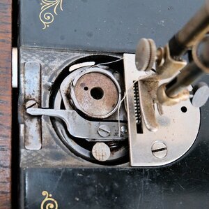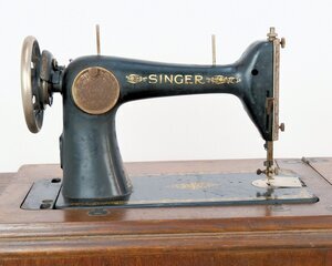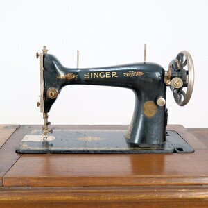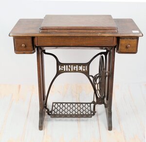 Unser Objekt, eine Singer 66, wurde ca. 1922 unter der Nummer C 2 437 598 in Wittenberge gebaut. Wahlweise wurde die Maschine als Koffermodell mit Handantrieb oder mit Eisengestell und Fußantrieb geliefert. Bei unserer Maschine ist das Tretgestell in ein offenes Holz-Untergestell montiert. Ob der hölzerne Unterbau im Original zu der Nähmaschine gehört ist nicht sicher, denn die Maschine passt nicht zu 100% in den vorgesehenen Ausschnitt. Unter der einfach furnierten Arbeitsplatte sind zwei Schubladen eingebaut. Ein weiteres Fach in der Mitte, kann mittels Kippmechanismus geöffnet werden. In den beiden Schubladen befinden sich noch mehrere Zubehörteile. (siehe Bild) Die Singer 66 war eine Maschine für viele Anwendungszwecke, da der neu entwickelte, horizontal drehender Greifer, fast alle Materialien verarbeiten kann. Die Maschine ist so robust konstruiert, dass sie unverwüstlich erscheint. Technisch gesehen handelt es sich um eine Geradstich, Flachbett-Nähmaschine mit dem Nadelsystem 705.
