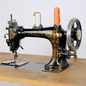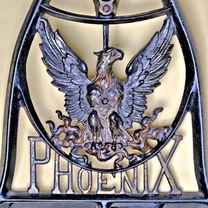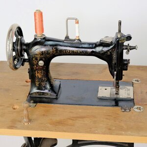 Die Nähmaschine Phönix Mod. „F“ wurde von der Firma Baer & Rampel, Bielefeld wurde zwischen 1891 bis 1900 hergestellt. Unser Objekt, mit der Herstellungsnummer 235621, lässt sich in etwa dem Produktionsjahr 1898 zuordnen. Auf der Abdeckplatte der Spule ist der Name des Herstellers und die Fabriknummer eingraviert. Maschine und Grundplatte sind schwarz lackiert und mit goldfarbenen Mustern und bunten Blumen aufgelockert. Der Name „PHÖNIX“ ist beiderseits am Maschinenarm angebracht. Ausgeliefert wurde der „Schnellnäher mit Rundgreifer“ als Tischmodell, mit einem Gusseisernen Unterbau. Irgendwann wurde die Tischplatte (nicht ganz professionell) erneuert und die alte Schublade wieder angebracht. Sie enthält noch verschiedene Nähutensilien, die größtenteils in einer Blechschachtel untergebracht sind. Abgedeckt wird die Maschine mit einer Holzhaube, ebenfalls mit dem Namen Phönix. Die Schlösser von Haube und Schublade sind funktionsfähig, der Schlüssel noch vorhanden. Der Gusseiserne Unterbau ist ca. 8 cm schmäler wie bei den meisten Maschinen, da die Konstrukteure das Schwungrad außerhalb des Fußraums angebracht haben. Rechts und links an den Seitenteilen, ist das Firmenlogo (der Phönix) mit eingegossen. (s. Bild) Leider ist die Mechanik so verharzt, dass eine Bewegungkaum noch möglich ist.