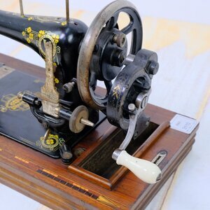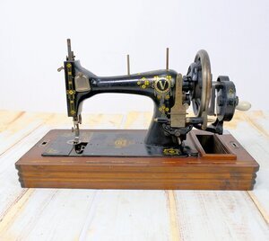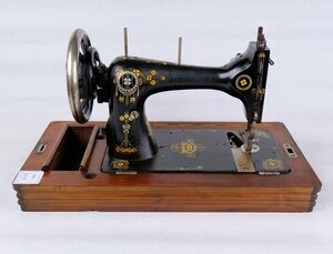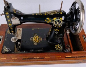 1863 wurde die Victoria-Nähmaschinenfabrik in Saalfeld von Richard Knoch gegründet. Nach 1945 wurde die Fa. Enteignet und in einen VEB Betrieb eingegliedert. Unser Modell ist eine Victoria „V“ die unter der Fabrik Nr. 359 262 ca. 1905 in Saalfeld hergestellt wurde. Es ist eine tragbare Version, die auf einem furnierten, ca. 6 cm hohen Holzsockel steht. Grundplatte und Maschine sind schwarz lackiert und mit, goldfarbene, vierblättrige Kleeblätter, verziert. Mit Ausnahme eines großen „V“ auf der Vorderseite gibt es keine weiteren Beschriftungen. Auch die sonst übliche Metallplakette des Herstellers war nie angebracht. Das Schwingschiffchen fehlt leider und ist auf Grund der Konstruktion (großer Bogen) auch nicht einfach zu ersetzten. Der Antrieb erfolgt per Hand und ist insgesamt in einem guten Zustand. Der Aufspulapparat ist vollständig, jedoch das Antriebsgummi gerissen. Technisch gesehen handelt es sich um eine Schwingschiffchen, Flachbett Nähmaschine mit Handantrieb und Rückwärtslauf. Möglicherweise passt ein Schiffchen der Fa. Mundlos, die in kleiner Auflage auch Maschinen mit gleicher Bogengröße bauten.