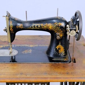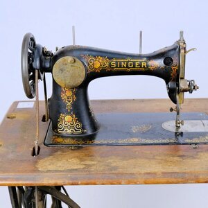 Unser Objekt ist eine Geradstich Flachbett Nähmaschine, von Singer, Modell 15 D. Hergestellt ca. 1909, unter der Nummer C 552 887 in Wittenberge/Elbe. Das Modell 15 D war eine sehr erfolgreiche Maschine und wurde in verschiedenen Ausführungen hergestellt. Es war eine hochwertige Maschine mit robuster Technik die über viele Jahrzehnte gebaut wurde. Arm und Grundplatte der Nähmaschine haben eine schwarze Grundfarbe. Aufgelockert mit goldfarbenen/bunten Verzierungen und kleinen Blumenblüten. Das Untergestell ist aus Gusseisen mit dem Namenszug Singer in der Mitte und dem Singer Logo auf beiden Seitenteilen. Der Antrieb erfolgt über ein Fußpedal und Keilriemen. Abgedeckt wird die Maschine mit einer Holzhaube, ebenfalls mit einem bunten Singer Logo auf der Vorderseite. Unterhalb der Holzplatte ist eine Schubladen, zur Aufnahme von Zubehör und Nähutensilien, angebracht. Bei Bedarf kann die Arbeitsplatte um 20cm durch Hochklappen eines Seitenteils verlängert werden. Die Maschine hat deutliche Gebrauchsspuren, von der Haube fehlen die Scharniere.