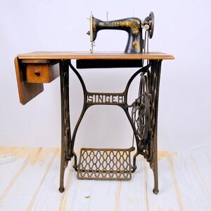 Unser Objekt ist eine Geradstich Flachbett Nähmaschine, von Singer, Modell 15 D. Hergestellt ca. 1909, unter der Nummer C 552 887 in Wittenberge/Elbe. Das Modell 15 D war eine sehr erfolgreiche Maschine und wurde in verschiedenen Ausführungen hergestellt. Es war eine hochwertige Maschine mit robuster Technik die über viele Jahrzehnte gebaut wurde. Arm und Grundplatte der Nähmaschine haben eine schwarze Grundfarbe. Aufgelockert mit goldfarbenen/bunten Verzierungen und kleinen Blumenblüten. Das Untergestell ist aus Gusseisen mit dem Namenszug Singer in der Mitte und dem Singer Logo auf beiden Seitenteilen. Der Antrieb erfolgt über ein Fußpedal und Keilriemen. Abgedeckt wird die Maschine mit einer Holzhaube, ebenfalls mit einem bunten Singer Logo auf der Vorderseite. Unterhalb der Holzplatte ist eine Schubladen, zur Aufnahme von Zubehör und Nähutensilien, angebracht. Bei Bedarf kann die Arbeitsplatte um 20cm durch Hochklappen eines Seitenteils verlängert werden. Die Maschine hat deutliche Gebrauchsspuren, von der Haube fehlen die Scharniere.