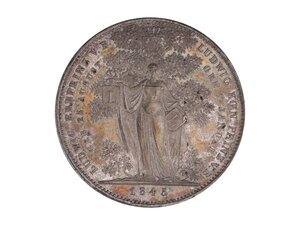Die Personifikation der Bavaria in einer entfernt mittelalterlichen Gewandung steht vor einem Eichenbaum. In dessen Krone befindet sich ein königliches Wappenschild. Bavaria hält in ihrer Linken und in ihrer Rechten jeweils ein Monogrammschild, das den Buchstaben "L" trägt. Die Aufschrift lautet: "LUDWIG ERBPRINZ V. B. GEB. 25. AUGUST - LUDWIG KOEN. PRINZ V. B. GEB. 7. JANUAR 1845". Der Revers zeigt König Ludwig I. im Profil. Mit dem vorliegenden Typ wurde der Geburt des Erbprinzen Ludwig, des späteren Königs Ludwig II., sowie der Geburt dessen Cousins Ludwig, dem späteren König Ludwig III., gedacht. Ludwig II. wurde in Schloss Nymphenburg bei München als ältester Sohn des Kronprinzen Maximilian und der Kronprinzessin Marie geboren. Er wurde auf den Namen Otto Friedrich Wilhelm Ludwig getauft, Rufname sollte jedoch auf Drängen des gleichnamigen Großvaters, der ebenfalls an einem 25. August geboren worden war, „Ludwig“ sein. Ludwig I. wurde Taufpate des Neugeborenen. Die Geschichtstaler nutzte Ludwig I. gekonnt, um sich und seine Familie ins Bild zu setzen. Die Darstellungen verweisen auf die Fortschritte Bayerns unter seiner Regentschaft im Bereich der Gesetzgebung, Infrastruktur, des Handels und des Bildungswesens. Die glückliche Verbindung von Tradition und Fortschritt ergibt sich im Überblick der einzelnen Taler, die sowohl die Verbindungen zur katholischen Kirche als auch die Förderung moderner Vorhaben wie der Eisenbahn als gedenkwürdig herausheben. Ludwig verweist auf die von ihm gestifteten Denkmäler zu Ehren der bayerischen Armee sowie verdienter Persönlichkeiten des Landes, darunter Vertreter aus Kunst und Literatur, womit er sie in doppelter Weise ins Gedächtnis der Bürgerinnen und Bürger einschreibt. Die Geschichtstaler wurden mitunter auch zur Kommunikation mit den Untertanen verwendet, so bedankte sich Ludwig in monarchischer Manier mittels einer Münzprägung von 1830 für die Treue der Bayern während der französischen Unruhen. Die propagandistische Absicht, patriotische Umlaufmünzen zu schaffen, erfüllte sich nicht, da die Geschichtstaler nur in geringen Auflagen geprägt wurden und eher bei Sammlern beliebt waren und weniger im Zahlungsverkehr genutzt wurden.