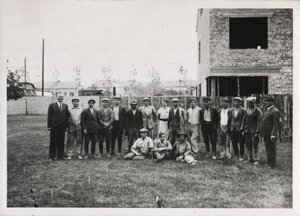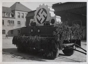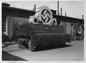 Fünf Fotografien. Auf den ersten drei Aufnahmen ist jeweils im Hintergrund der Rohbau eines hinter einem Bretterzaun erichteten Büro- oder Wohngebäudes zu erkennen. Es handelt sich um einen 2 1/2geschossigen Bau. Im Vordergrund bzw. vor dem Bretterzaun befindet sich eine Gruppe von ca. 18 Personen. Aufgrund der guten Absatzmöglichkeiten der von der Firma Zettelmeyer hergestellten Produkte führte die Firma in dieser Zeit in Konz eine Reihe von Um- und Erweiterungsbauten durch. Mutmaßlich handelt sich beim abgebildeten Objekt um eine solche Baumaßnahme der Firma Zettelmeyer. Die Bilder vier und fünf zeigen einen mit Tannenzweigen geschmückten Anhänger. Der Anhänger ist mit einem Aufbau versehen, der drei ineinander greifende Zahnräder zeigt. Vor diesen Zahnrädern stehen Modellfahrzeuge der von der Firma Zettelmeyer produzierten Baumaschinen. Erkennbar ist unter anderem eine Dampfwalze. Auf dem mittleren Zahnrad und dem unter den Zahnrädern befindlichen Sockel sind nationalssozialistische Symbole angebracht. Im Hintergrund des festlich geschmückten Wagens ist auf Bild vier das Zettelmeyer-Verwaltungegebäude zu erkennen. Die beiden Bilder des Anhängers wurden am 01.05.1937 aufgenommen. Unter den nationalsozialistischen Feiertagen nahm der 1. Mai seit Mitte der 1930er Jahre eine besondere Stellung ein. Die frühere Bedeutung dieses Datums als der wichtigste Festtag der Arbeiterschaft wurde verdrängt. Seit 1934 wurde der Festtag in "Nationaler Feiertag des deutschen Volkes" umbenannt.