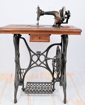 Unter der Fabriknummer 1.304.560 wurde unser Objekt 1913 von der Firma Pfaff in Kaiserslautern gebaut. das Modell „ B“ kam bereits 1885 auf den Markt und hatte Anfangs noch eine Geigenförmige, geschwungene Grundplatte. Diese wurde später, wie bei unserem Modell, durch eine rechteckige Variante ersetzt. Auf Wunsch wurde das Modell als tragbare Ausführung, oder eingebaut in einen Nähtisch mit Fußantrieb geliefert. Da unsere Maschine über beide Antriebsarten verfügt, ist vermutlich die tragbare Ausführung erst später in einen Nähtisch eingesetzet worden. Verkauft wurde diese Maschine unter der Händlermarke „Th.Acht, Trier“. Der Inhaber wußte schon damals von den Vorteilen einer Eigenmarke. So verkaufte er die Nähmaschinen unter seinem Namen und ließ sogar das Firmenlogo "TH. ACHT" in den gusseisernen Unterbau einarbeiten. Auch auf dem Maschinenarm ist nicht die Plakette des Herstellers "Pfaff Kaiserslautern" angebracht, sondern die des Händlers aus Trier, mit der Porta Nigra. (s. Abbildung) Die Nähmaschine ist schwarz lackiert und hat goldfarbenen Verzierungen, zu der auch kleine Blumenblüten gehören. In die Grundplatte sind mittig sechs größere Perlmutteinlagen eingearbeitet. Der Spuler schein noch funktionsfähig zu sein, jedoch fehlt der Gummibelag vom Antriebsrad. Obwohl es zu dieser Zeit schon Schwingschiffchen gab, hat Paff noch ein Langschiffchen verbaut, da diese wegen der guten Stichbilder, sehr beliebt waren. (Langschiffchen werden in gerader Bahn bewegt. Schwing- bzw. Bogenschiffchen bewegen sich bogenförmig.) Der Antrieb bei unserem Objekt erfolgt ursprünglich über eine Handkurbel, wurde aber später durch den Einbau in einen Nähtisch auf Tretantrieb umgestellt. Zur Aufnahme von Nähutensilien befindet sich unterhalb des Nähtrisches eine Schublade. Auf dem Nähtisch selbst hat sich leider, in einer Größe von 20x20 cm, das Furnier gelöst.