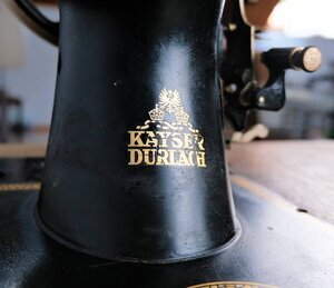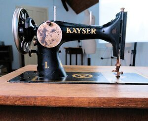 Unser Objekt ist eine Nähmaschine der Firma Kayser, damals ansässig in Karlsruhe-Durlach. Die Maschine gehört zur Modelllinie „L“, die ab 1920 hergestellt wurde. Unsere Maschine stammt aus den 1920er Jahren und trägt die Seriennummer 77996. Ausgeliefert als Tischmodell, versenkbar und Tretantrieb. Die Lackierung ist schwarz, mit goldfarbener Aufschrift „Kayser“, dem Buchstaben „L“, für das Modell und dem vollständigen Herstellernamen. Die Grundplatte ist mit einem einfachen Muster eingerahmt. In deren Mitte, das Firmanlogo ein Adler mit zwei Kronen. Das Untergestell ist komplette aus Holz gefertigt. Lediglich der Tretantrieb und das Rad für den Keilriemen sind aus Metall. Die Tischplatte ist einfach furniert. Unterhalb, sowie an der Seite, befinden sich zwei Fächer für Zubehör oder Nähutensilien. Das Modell L ist eine Geradstich, Flachbettmaschine mit Schwingschiffchen und Vor- und Rückwärtslauf. Die Mechanik ist robust und ausgereift, so dass diese Nähmaschinen meist heute noch laufen.
