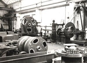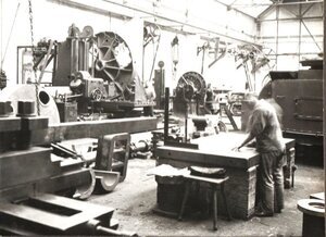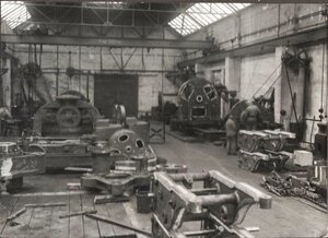 Schwarz-Weiß-Aufnahmen in Werkstatthallen der Firma Zettelmeyer