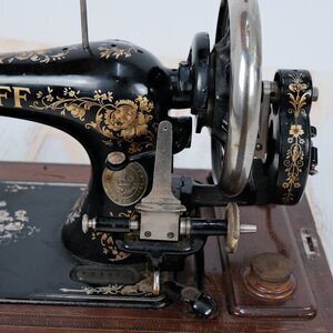 Das Modell „K“ der Firma Pfaff ist der Vorläufer der Pfaff 11. Unsere Nähmaschine wurde 1905 mit der Seriennummer 733 940 in Kaiserslautern gebaut.Verkauft wurde sie, je nach Wunsch, als Koffermaschine mit Handkurbel oder als Tischmodell mit Tretantrieb. Unser Tischmodell hat einen hölzernem Sockel und eine Abdeckhaube. In den Unterbau ist eine kleines Fach, zur Aufbewahrung von Nähutensilien eingebaut, das durch einen Schiebedeckel verschlossen wird. Die Maschine ist schwarz lackiert, mit goldfarbenen Ornamenten und rankenden Blumenblüten verziert. An der Vorderseite findet sich die Modellbezeichnung „K“ sowie Schriftzug „Pfaff“ in goldenen Buchstaben. Die Maschine ist gut erhalten. Handkurbel und Spuler sind funktionsfähig. Die Haube wurde irgendwann neu Lackiert und der fehlende Originalgriff durch einen einfachen Blechgriff ersetzt. Schloss und Schlüssel funktionieren. Für diese Maschine ist noch die Original Gebrauchsanweisung vorhanden. (siehe Link) Demnach wurde sie am 22 März 1906 an den Wilhelm Broders in Kiel ausgeliefert. Das Nähmaschinengeschäft das sie verkauft hat war, lt Gravur auf dem Spulendeckel, die Firma A.C. JUNG JOHANN aus Kiel. Technisch gesehen handelt es sich um eine Geradestichmaschine mit einem Bogenschiffchen und Handantrieb.