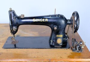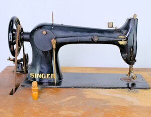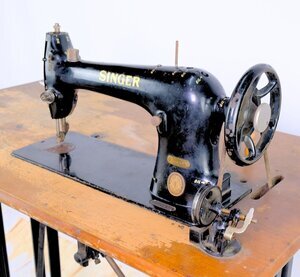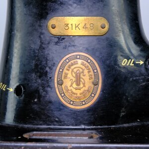 Bei unserer Singer 31 K48 handelt es sich um eine Industrienähmaschine mit Zentralspule, die primär im verarbeiteten Kleingewerbe Verwendung fand. Dafür spricht der manuelle Tretantrieb statt eines Elektromotors, der 1952 bei größeren Betrieben längst Einzug gehalten hatte. Aber auch der große Arbeitstisch mit dem separat angebauten Aufspuler spricht dafür. Er ist so montiert, dass der Antrieb über den Keilriemen erfolgen kann. (s.Abb). Zur Unterbringung von Nähutensilien ist unter dem Nähtisch eine Schublade eingebaut. Hergestellt wurde die Maschine in England, unter der Nummer EH 262 999 im Jahr 1951. Wie alle im Jubiläumsjahr 1951 hergestellten Nähmaschinen, hat auch Diese ein blau umrahmtes Firmenlogo am Ständer. Die Maschine ist nicht versenkbar. Sie kann lediglich zu Seite gekippt werden, um an die Unterseite zu gelangen. Das sehr schwere, gusseiserne Untergestell trägt, oberhalb des Tretmechanismus, in großen Buchstaben den Firmenname „SINGER“.
