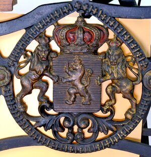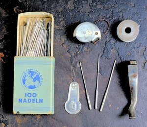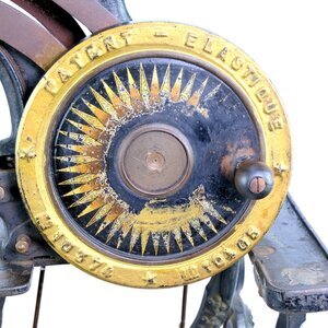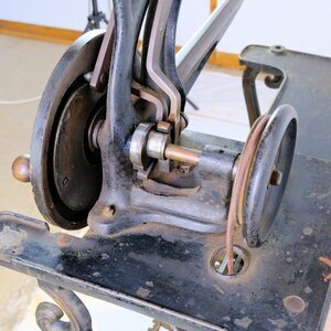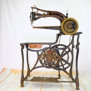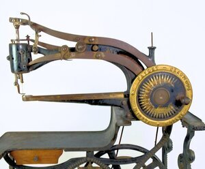 Diese Ledernähmaschine kann bei einem Schuhmacher oder Sattler im Einsatz gewesen sein. Auf der Maschine selbst gibt es fast keine Hinweise, weder auf den Hersteller noch Typ oder Seriennummer. Die Freiarm Maschine besitzt eine Zentralspule und kann in alle Richtungen nähen, da der Nähfuß um 360 ° gedreht werden kann. Lediglich auf der kleinen Spulenabdeckung ist, kaum leserlich, ein kleines Claes-Logo und die Nummer 2120 00 ?? eingestanzt. Auf der Handkurbel steht noch der Hinweis auf „Patent-Elastique“ sowie zwei Patent Nummern 10374 und 10205. Der Innenbereich des Handrads ist, gleich einer Windrose, in gold/brauner Farbe verziert. Unterhalb des Arbeitstisches ist eine hölznerne Schublade angeordnet, die noch mit Nähnadeln und anderen Zubehörteilen gefüllt ist. Der Unterbau besteht aus massiv Eisen und wird von einem Wappen geschmückt, dass wir leider nicht zweifelsfrei zuordnen können. (s. Bild) Der Antrieb erfolgt entweder per Hand oder über das Fußpedal mit Keilriemen. Die Firma Claes, deren Sitz in Mühlhauseb/Thüringen war, wurde nach dem Krieg enteignet und ging in dem Kombinat TEXTIMA auf.