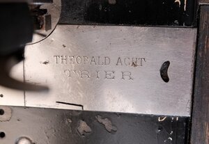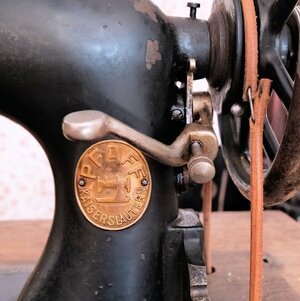 Das Nähmaschinen Modell Pfaff 11, wurde von 1915 bis 1940 in Kaiserslautern gebaut. Es ist ein Singer Nachbau, was zu dieser Zeit ohne Konsequenzen noch möglich war. Unser Objekt, mit der Produktionsnummer 1.939.258, stammt aus dem Jahre 1926. Maschine und Grundplatte sind schwarz lackiert. Auf der Grundplatte sind noch Reste einer goldfarbenen Umrandung zu sehen. Auf der Maschinen-Vorderseite befinden sich der Firmenname, sowie eine Metallplakette mit dem Pfaff Firmenlogo. Auf der Rückseite findet sich ebenfalls der Name Pfaff und zusätzlich die „11“ als Modellnummer. Die hölzerne Tischplatte zeigt deutliche Gebrauchsspuren, ebenso die dazugehörende, hölzerne Abdeckhaube. In das Gusseiserne Untergestell ist, auf beiden Seitenteilen sowie in der Mitte, der Name PFAFF in goldfarbenen, großen Buchstaben eingearbeitet. Eine kleine Besonderheit findet sich auf dem Abdeckblech der Spule. Dort ist der Name „Theodor Acht, Trier eingraviert. (siehe ergänzenden Text) Der Antrieb erfolgt über einen Tretmechanismus mit Schwungrad, das über einen Lederriemen, mit dem Handrad verbunden ist. Technisch gesehen handelt es sich um eine Bogenschiffmaschine, Geradstich mit Vor-und Rückwärtsnähen. Der beigefügten Link führt zur Original Bedienungsleitung der Modelle Pfaff 11 und 12