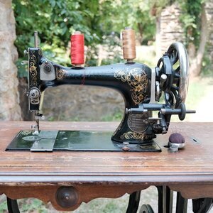 Die Nähmaschine mit dem Namen „Eveline“ ist eine Eigenmarke der Firma Theobald Acht aus Trier. Hergestellt von der Firma Pfaff aus Kaiserslautern. Um welches Modell es sich genau handelt konnten wir nicht mit Sicherheit herausfinden. Die Maschine mit der Herstellungsnummer 1.823 008 stammt aus dem Jahr 1924 und wurde mit Tretantrieb ausgeliefert. Auf beiden Seiten des Gusseisernen Untergestells wurde der Name „Th. Acht, Trier“ schon in die Gussform mit eingearbeitet. Auch auf dem Maschinenarm ist die Metallplakette des Händlers aus Trier, mit der Porta Nigra angebracht. (s. Abbildung) Die Nähmaschine ist schwarz lackiert und mit vielen goldfarbenen Verzierungen versehen, auf denen zwei stilisierten Tauben besonders auffallen. Die Tischplatte ist ringsum mit Intarsien Arbeiten versehen und hat an der Vorderkante –ebenfalls eine Einlegearbeit – eine kombinierte cm/Inch Längentabelle. Auf der Unterseite befinden sich zwei Schubladen, die der Aufnahme von Zubehör dienen. Passend zum Holz der Tischplatte ist die Nähmaschine durch eine Haube geschützt, die mit dem Modellnamen „Eveline“ in goldfarbener Schrift verziert ist. Technisch gesehen handelt es sich um eine Bogenschiffmaschine und Fußantrieb.