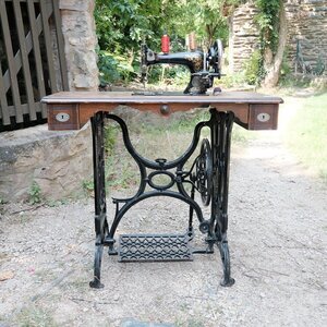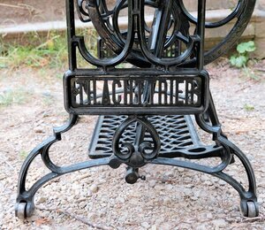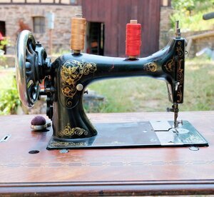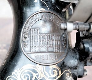 Die Nähmaschine mit dem Namen „Eveline“ ist eine Eigenmarke der Firma Theobald Acht aus Trier. Hergestellt von der Firma Pfaff aus Kaiserslautern. Um welches Modell es sich genau handelt konnten wir nicht mit Sicherheit herausfinden. Die Maschine mit der Herstellungsnummer 1.823 008 stammt aus dem Jahr 1924 und wurde mit Tretantrieb ausgeliefert. Auf beiden Seiten des Gusseisernen Untergestells wurde der Name „Th. Acht, Trier“ schon in die Gussform mit eingearbeitet. Auch auf dem Maschinenarm ist die Metallplakette des Händlers aus Trier, mit der Porta Nigra angebracht. (s. Abbildung) Die Nähmaschine ist schwarz lackiert und mit vielen goldfarbenen Verzierungen versehen, auf denen zwei stilisierten Tauben besonders auffallen. Die Tischplatte ist ringsum mit Intarsien Arbeiten versehen und hat an der Vorderkante –ebenfalls eine Einlegearbeit – eine kombinierte cm/Inch Längentabelle. Auf der Unterseite befinden sich zwei Schubladen, die der Aufnahme von Zubehör dienen. Passend zum Holz der Tischplatte ist die Nähmaschine durch eine Haube geschützt, die mit dem Modellnamen „Eveline“ in goldfarbener Schrift verziert ist. Technisch gesehen handelt es sich um eine Bogenschiffmaschine und Fußantrieb.