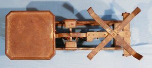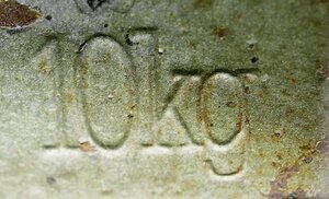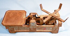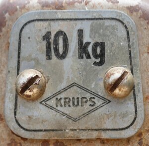 Einfache Tafelwaage für 10 kg Maximalgewicht nach dem Konstruktionsprinzip von Joseph Béranger. Eine Tafelwaage unterscheidet sich von einer einfachen Balkenwaage durch das Gestänge im Inneren. Dieses bewirkt, dass das Moment am Waagebalken von der Position der Gewichte auf der Schale unabhängig ist. Auch werden Schrägstellung als auch Standortbewegungen bei der Béranger-Waage besser kompensiert, was die Nutzungsmöglichkeiten der Tafelwaage wesentlich erweitert. Die Waage besitzt auf jeder Seite eine Plakette mit der Aufschrift 10 kg und dem Logo von Krups aber keine Zierelemente. Die Waage ist einfach aber zweckmäßig aus mittlerweile ziemlich verchromten Eisenblech gefertigt. An Stellen wo die Verchromung abgegangen ist ist sie etwas verrostet. Vorne an der Waage befindet sich eine Plakette mit einem Logo der Firma Krups und darüber die Aufschrift 10 kg. Ersteres bezeichnet den Hersteller und letzteres die maximale Last die diese Waage verkraften konnte. Interessanterweise befindet sich rechts am Waagebalken ein Punze mit dem Logo der Baubeschlagfabrik GmbH, Menden und links gegen über die Punze 10 kg. Anzunehmen ist, dass Krups mindestens das Gestänge dieser Waage von diesem Unternehmen dazugekauft hat oder dass eine beschädigte Waage mit einer Hülle von Krups wieder als Waage nutzbar gemacht wurde. Auf der Vorderseite klebt ein Aufkleber mit dem Eichzeichen "4 / D / sechsstrahliger Stern" im Schild 86 und darunter der Text geeicht bis 1986. Die Waage ist vor allem aufgrund ihrer Eichstempel und der Eichplakette interessant. Das ist für derartige Waagen eher ungewöhnlich und zeit dass sie im gewerblichen Gebrauch gewesen ist. Auf einer Plombe ganz rechts auf dem Waagebalken befindet sich das Eichzeichen 4 / D / 0 und die vier Jahreszeichen 78, 80, 82, 84 in Schildern. Die "4" steht für den Aufsichtsbezirk Bad Kreuznach und die spätere Eichdirektion des Landes Rheinland-Pfalz. Bis 1983 hatten die Eichämter noch eigene Ordnungszahlen. Hier die "9" für das Eichamt Trier. Seit 1983 erfolgte für ganz Rheinland-Pfalz die Stempelung nur noch mit der „4“ und dem sechsstrahligen Stern Wir bedanken uns beim Landesamt für Mess- und Eichwesen Rheinland-Pfalz und beim Stadt- und Waagenmuseum Orschatz für wertolle Informationen zu dieser Waage.