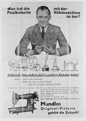 Was hat die Postkutsche mit der Nähmaschine zu tun ?“ Mit dieser provozierenden Frage hat die Firma Mundlos ein Werbeblatt für Ihre Nähmaschinen herausgebracht. Auf einer DIN A4 Seite, beidseitig bedruckt, wird der Verbraucher auf alle Vorteile dieser Nähmaschinen Marke hingewiesen. Insgesamt sind 40 Fähigkeiten aufgelistet, die das Spektrum der Maschine beschreibt. Abgebildet ist eine Postkutsche, ein Federkiel mit Tintenglas, ein Talglicht und eine moderne Mundlos Nähmaschine.