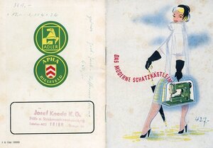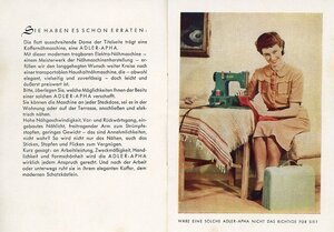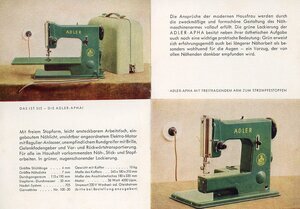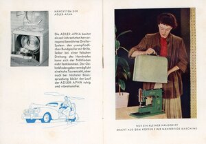 Unter Apha firmieren die Zusammenschlüssen der deutschen Nähmaschinen Unternehmen Anker, Phönix, Adler. Der Zusammenschluss war um dem steigenden Druck der Improte geschuldet. Die Produktion endete Ende der 1970er Jahre. Eine Werbebroschüre für die Koffernähmaschine Apha-Adler. Auf 16 Seiten im Postkartenformat bewerben die Adler Werke ihre neue Koffernähmaschine. Der Werbeslogan "Das moderne Schatzkästlein" wendet sich an die moderne Frau, die Interesse an kleinen, tragbaren Nähmaschinen hat. Die Broschüre hat farbige sowie s/w Abbildungen, mit deren Hilfe die Vorzüge der Maschine visuell unterstützt werden. Herausgestellt werden besonders der geräuschlos arbeitende Antriebsmotor und das blendfreie Nählicht. Auf den letzten Seiten wird die Kundin aufgefordert, sich doch die Adler Apha unverbildlich vorführen zu lassen.