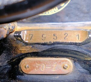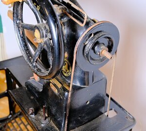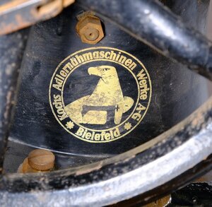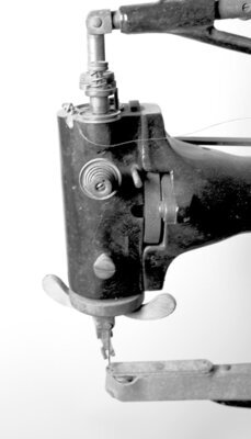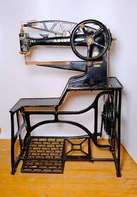 Die Fabrik Nummer lautet 79521. Unser Objekt ist eine Adler Schuhmacher Nähmaschine „Klasse 30–1“. Dieser Maschinentyp wurde in verschiedenen Varianten gebaut. Die Ziffer nach der Klasse (30), gibt Auskunft über die Variante. So steht die Bezeichnung 30 – 1, für die Variante: 47 cm Stahlarm, kleine Schiffchen, kurze Nadeln. Oder die Bezeichnung 30 – 27, für die Variante: 37 cm Stahlarm, großes Schiffchen, lange Nadeln zum Nähen von Sätteln. Die Verstellung der Nährichtung erfolgt durch das Drehen des Kopfgriffes, wodurch eine Richtungsänderung bis 360° möglich ist. Das Alter der Maschine konnten wir mit Hilfe des Firmenlogos, das sich im Laufe der Zeit änderte, grob zu ordnen. Demnach wurde unser Objekt zwischen 1922 und 1935 hergestellt. Das Nähmaschinen Oberteil ist auf ein eisernes Gestell montiert und mit vier Maschinenschrauben verbunden. Die Wipp Bewegung des Fußpedals, wird in eine rotierende Bewegung umgesetzt. Der Lederriemen kann wahlweise auf das größere oder kleinere Schwungrad gezogen werden, was direkten Einfluß auf die Nähgeschwindigkeit hat. Zur Verwendung gelangen Nadeln des Systems 332 mit verschiedenen Spitzen. Die Runden für Stoff und Schneidenadeln für Lederarbeiten. Wie bei allen mechanischen Maschinen gibt es auch bei der Adler 30 eine Unmenge von Öllöchern die permanent mit säurefreiem Öl versorgt werden müssen. Nur so ist ein störungsfreier Betrieb möglich. Die Maschine ist noch unrestauriert und daher z Zt. nicht funktionsfähig. Die beschriebene Maschine steht heute in unserer Schusterwerkstatt die für Besucher zugängig ist.