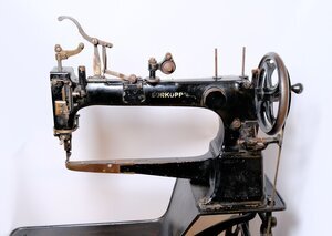 Diese Original Dürkopp Schuhmacher Ledernähmaschine trägt die Seriennummer 29 690. Produziert vermutlich Anfang der 1930er Jahren in Bielefeld. Ober- und Unterteil werden durch Schrauben miteinander verbunden. Es ist eine sehr schwere Maschine, die ausschließlich für den stationären Betrieb vorgesehen ist. Leider ist das Abziehbild mit der Modellangabe entweder abgegriffen oder wurde irgendwann überlackiert. Wir sind aber ziemlich sicher, dass es sich um das Modell 18 handelt. Der Name Dürkopp ist auf dem Maschinenarm beidseitig noch vorhanden. Die Nährichtung dieser Freiarmmaschine erfolgt durch das Drehen des Kopfgriffes, wodurch eine Richtungsänderung bis 360° möglich ist. Der Antrieb erfolgt manuell mit Tretpedal und Keilriemen. Das Tretpedal wurde mit einem aufwändigen Muster gegossen, ebenso das darüber angebrachte Logo. Beides ist, wie der ganze Unterbau, schwarz lackiert. Ob der äußerst gut erhaltene Lack original ist, oder einmal nachlackiert wurde, wissen wir nicht. Die Maschine steht heute in unserer Schusterwerkstatt und kann von den Besuchern bestaunt werden