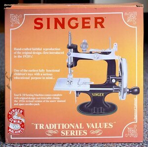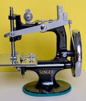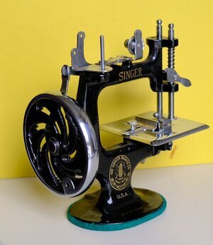 Eine Funktionsfähige Kindernähmaschine von Singer, die an das Original der Singer K 20 angeleht ist. Hergestellt in der Türkei in den 1950er/1960 Jahren. Der Korpus ist aus Gusseisen, der Rest der Maschine aus Metall hergestellt. Einige Teile sind zusätzlich verchromt. Mit dieser Maschine war es Kindern durchaus möglich für ihre Puppen Bekleidung zu nähen. Ein Gebrauchsanweisung in engl. Sprache ist der Maschine beigepackt. Die Spielzeugnähmaschine ist noch in ihrerm Original Karton verpackt.