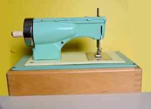 Blech-Kindernähmaschine mit Namen “Casige”. Lackiert in türkis/beige ist das Maschinchen auf einem 4 cm hohem Holzsockel montiert. Das gleiche Modell gab es auch mit einem Blechsockel. Es ist ein einfaches Blechspielzeug, dass in Deutschland in den 1950er Jahren hergestellt wurde. Ein echte Nähfunktion war ursprünglich möglich, wozu das Handrad mauell gedreht erden musste.