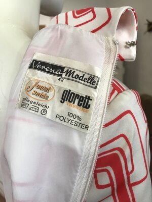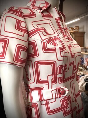 Weißes Sommerkleid mit rotem graphischem Muster, ganz gefüttert, mit Hemdblusenkragen und Zierknöpfen. Im Taillienbereich ein Vorne offener Gürtel mit Zierknöpfen.