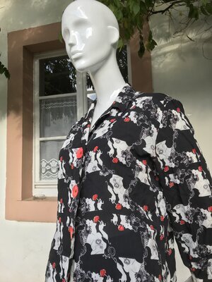 Lange schwarze Schlaghose mit silberfarbenen Lurexstreifen und einem Reißverschluss. Schwarze Bluse mit langen Ärmeln und Motivdruck sowie großen roten Knöpfen.