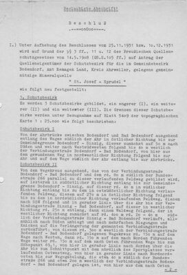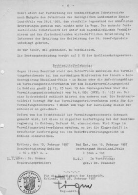 Beglaubigte Abschrift des gemeinsamen Beschlusses des Oberbergamtes Rheinland-Pfalz und Bezirksregierung Koblenz von 15.2.1957. Mit dem Beschluss wurden die drei Quellschutzzonen definiert und in einer Karte im Maßstab 1:25.000 eingetragen. Damit waren die Quellschutzfestlegungen vom 25.11.1931 und 10.12.1931 aufgehoben.