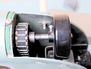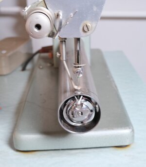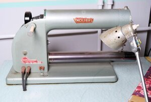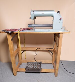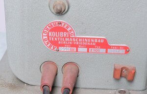 Diese Spezialnähmaschine der Marke Kolibri von dem Hersteller Arno Lohhmüller aus Berlin Friedenau, hat die Typenbezeichnung Z 101. Sie wurde in den 1960er Jahren unter der Seriennummer 0918 hergestellt. Die Nähmaschine hat eine hellgrüne-Metallic Lackierung. Der Markenname "Kolibri", sowie weitere Angaben der Firma sind als Abziehbild angebracht.. Es handelt sich um eine Freiarmmaschine mit hölzernem Nähtisch und elektrischen Antrieb. Damit der Motor einfach und gefühlvoll gesteuert werden kann, hat der Besitzer die Pedalsteuerung unter das Fußpedal einer alten Nähmaschine gebaut. (s. Bild). Der Antrieb vom Motor zur Maschine, erfolgt über eine Schnurkette, die den altbekannten Lederriemen abgelöst hat. Unser Objekt ist eine Spezialmaschine, die zur Herstellung von Knirps Schirmhüllen Verwendung fand. Deswegen auch der runde Arm, in dessen Spitze die Zentralspule sitzt. Der bisherige Besitzer der Maschine, die Firma Genevirere aus Koblenz, gehörte zu den 12 Geschäften in Deutschland, die Autorisiert waren die Endkonfektionierung des Knirps vorzunehmen. Die Maschine ist in unserer Schirmwerkstatt ausgestellt und für Besucher zugänglich.