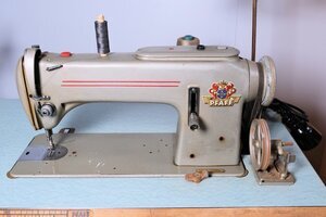 Das Modell 234K- 6B von Pfaff ist eine Schnellnähmaschine mit Elektroantrieb für Industrie, Handel und Handwerk. Sie stellt eine technische Weiterentwicklung der 134er Modellreihe dar. So wird die max. Stichzahl mit 4000/min. (leichte Stoffe) angegeben. Der Buchstabe „B“ in der Modellbezeichnung sagt jedoch, dass es sich bei unserem Modell um die Ausführungsart für mittlere Stoffstärken handelt. Die max. Nähgeschwindigkeit liegt dadurch bei 3600 Stiche/min. Die Maschine ist schon so komplex gebaut, das es eine spezielle Anweisung für den Techniker gibt. Die Schnellnähmaschine wurde Anfang der 1960er Jahre in Kaiserslautern gebaut. Die grün/beige metallic Lackierung wird durch zwei waagerechte, rote Dekorstreifen sowie dem Firmenlogo als Abziehbild, aufgelockert Der Unterbau ist ein stabiler Holztisch, an dem auch der große Elektromotor der Firma WEG (Typ: NKD 330 mit 2800 U/min.) befestigt ist. Verbunden ist er mit der Nähmaschine über einen Keilriemen. In den Unterbau integriert ist eine Schublade gefüllt mit Pfaff Ersatz- und Zubehörteilen. Die beschriebene Maschine stand ursprünglich in einer Koblenzer Schirmwerkstatt, womit die vorgeschnittenen Schirmbespannungen zusammengenäht wurde. Vor einigen Jahren bekam unser Museum die komplette Werkstatt geschenkt und ist heute für unsere Besucher zugängig.