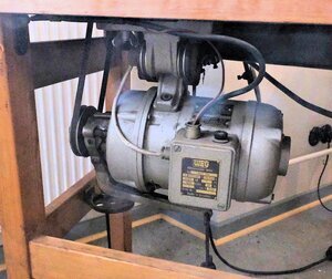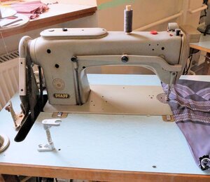 Das Modell 234K- 6B von Pfaff ist eine Schnellnähmaschine mit Elektroantrieb für Industrie, Handel und Handwerk. Sie stellt eine technische Weiterentwicklung der 134er Modellreihe dar. So wird die max. Stichzahl mit 4000/min. (leichte Stoffe) angegeben. Der Buchstabe „B“ in der Modellbezeichnung sagt jedoch, dass es sich bei unserem Modell um die Ausführungsart für mittlere Stoffstärken handelt. Die max. Nähgeschwindigkeit liegt dadurch bei 3600 Stiche/min. Die Maschine ist schon so komplex gebaut, das es eine spezielle Anweisung für den Techniker gibt. Die Schnellnähmaschine wurde Anfang der 1960er Jahre in Kaiserslautern gebaut. Die grün/beige metallic Lackierung wird durch zwei waagerechte, rote Dekorstreifen sowie dem Firmenlogo als Abziehbild, aufgelockert Der Unterbau ist ein stabiler Holztisch, an dem auch der große Elektromotor der Firma WEG (Typ: NKD 330 mit 2800 U/min.) befestigt ist. Verbunden ist er mit der Nähmaschine über einen Keilriemen. In den Unterbau integriert ist eine Schublade gefüllt mit Pfaff Ersatz- und Zubehörteilen. Die beschriebene Maschine stand ursprünglich in einer Koblenzer Schirmwerkstatt, womit die vorgeschnittenen Schirmbespannungen zusammengenäht wurde. Vor einigen Jahren bekam unser Museum die komplette Werkstatt geschenkt und ist heute für unsere Besucher zugängig.
