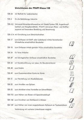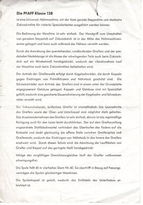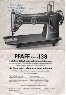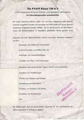 Auf vier DIN A5 Seiten bewirbt Pfaff seine Schnellnähmaschine der Klasse 138. In einheitlichem s/w Druck richtet sich die Werbung speziell an Handwerk, Gewerbe und Industrie. Neben den allgemeinen Vorzügen der 138er Klasse sind auch alle Unterklassen mit ihren Besonderheiten aufgeführt. Auf der letzten Seite werden noch alle Spezielarbeiten, die mit dieser Maschine ausgeführt werden können, aufgelistet. Das Werbeblatt ist auf der Vorderseite mit dem Stempel von Maria Ziegler, Textilwaren aus Humes/Saar versehen. Auf der letzten Seite ist ein weiterer Stempel, womöglich vom Käufer, "Hoffmann" aus Sulzbach zu erkennen.